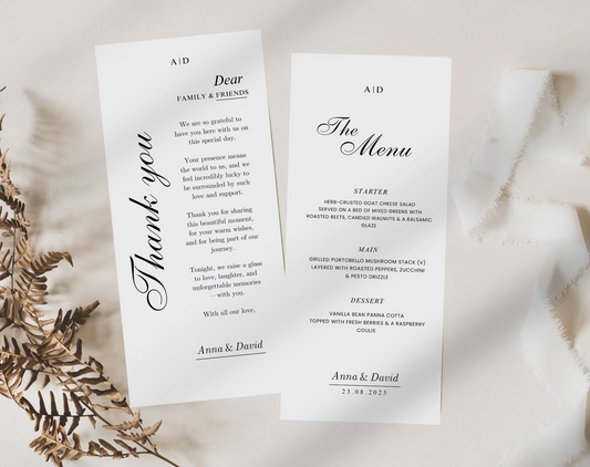Modern Wedding Menu & Thank You Card Set – Editable in Canva, Napkin Note Style Reception Menu, Customizable Wedding Stationery – WLP-LIN 7140