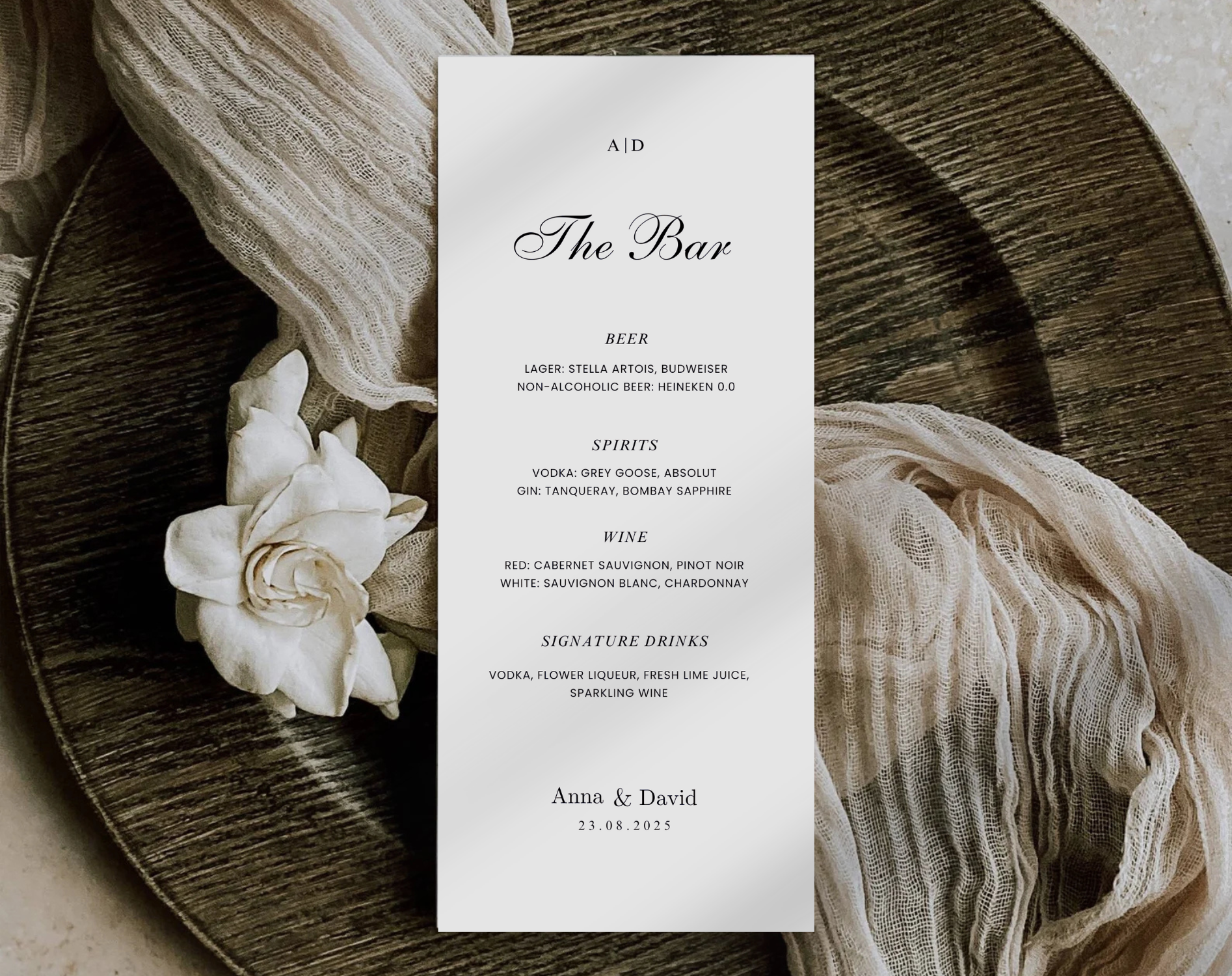 Customizable Bar Menu – Editable Canva Template for Weddings, Parties, & Events, Printable Cocktail Menuevent with this editable bar menu template. Perfect for weddings, parties, or special events, this printable cocktail menu is fully customizable in Canva. Easy to edit and print, it adds a unique flair to your drink station or bar setup.