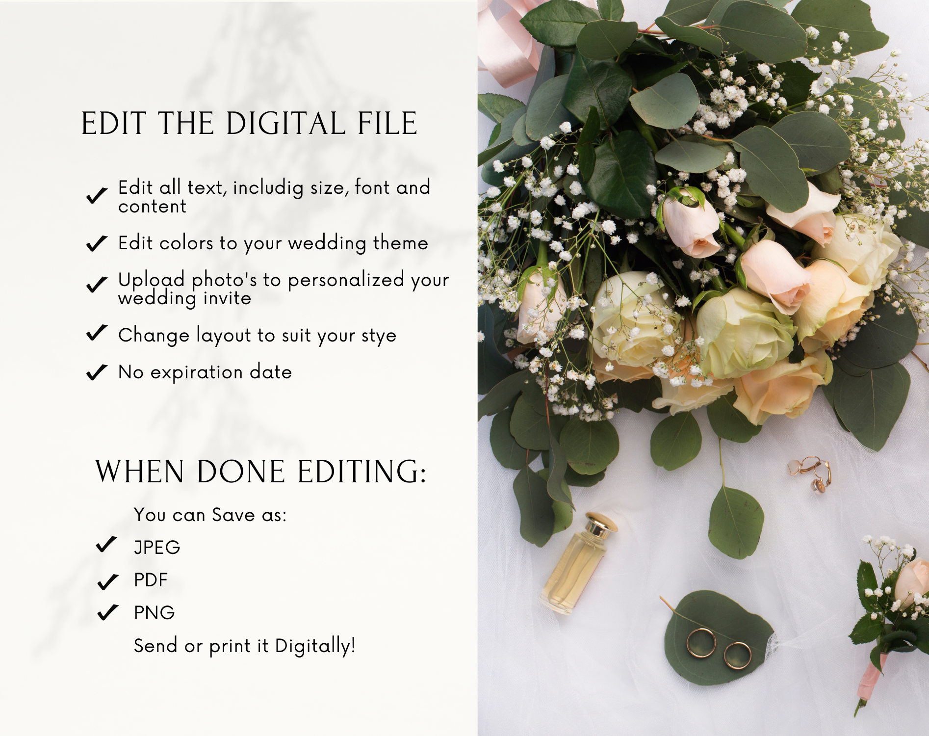This template is fully editable in Canva, allowing you to customize every detail — from the menu items to the thank you note, fonts, colors, and even layout. Whether you're hosting a formal black-tie affair or a minimalist modern wedding, this template will complement your reception décor perfectly.